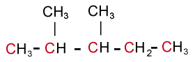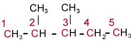 Par exemple, dans la structure ci-dessous, la chaîne linéaire la plus longue (les C de couleur) comporte cinq atomes de carbones; le nom du composé est donc attribué comme s'il s'agissait d'un dérivé du pentane (même si le composé compte au total sept atomes de carbone et est un isomère de l'heptane, C7H16).