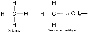 Dans lexemple ci dessus, chaque substituant ne compte quun atome de carbone. Un tel substituant dérive du méthane par la perte dun hydrogène st sappelle groupement méthyle.
