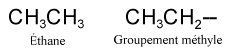 Le groupe alkyle à deux carbones est appelé éthyle, d'après l'éthane.